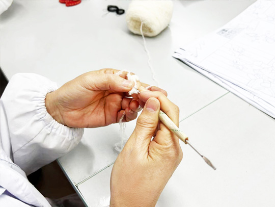 By using an acrylic fiber without scaling on the surface, the itchy texture is reduced, it becomes hand-washable, and most importantly, vivid colors can be produced. The next step was for Sone and his team to attempt to dye a 50% wool/50% acrylic blend fiber that was already being produced. However, the appearance and color they hoped for was not produced. This would not pass MIKI HOUSE standards. They decided they needed to make something new. This was the beginning of a round of trial and error for Sone and his team.