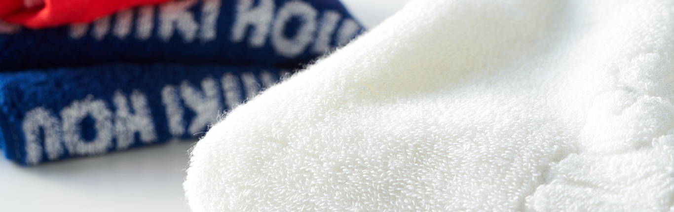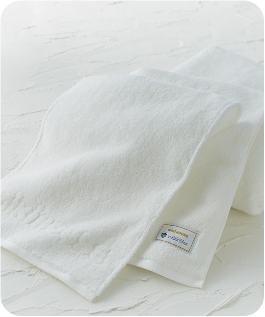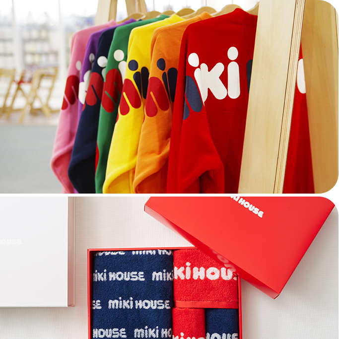 Our sweatshirt is one of them. Many of you may know our signature sweatshirt with the large logo print on the back. Similarly, many people love MIKI HOUSE's towels.