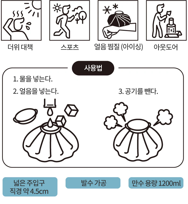 - 이 제품은 얼음 찜질 전용입니다. 물, 얼음 이외에는 넣지 말아 주십시오.