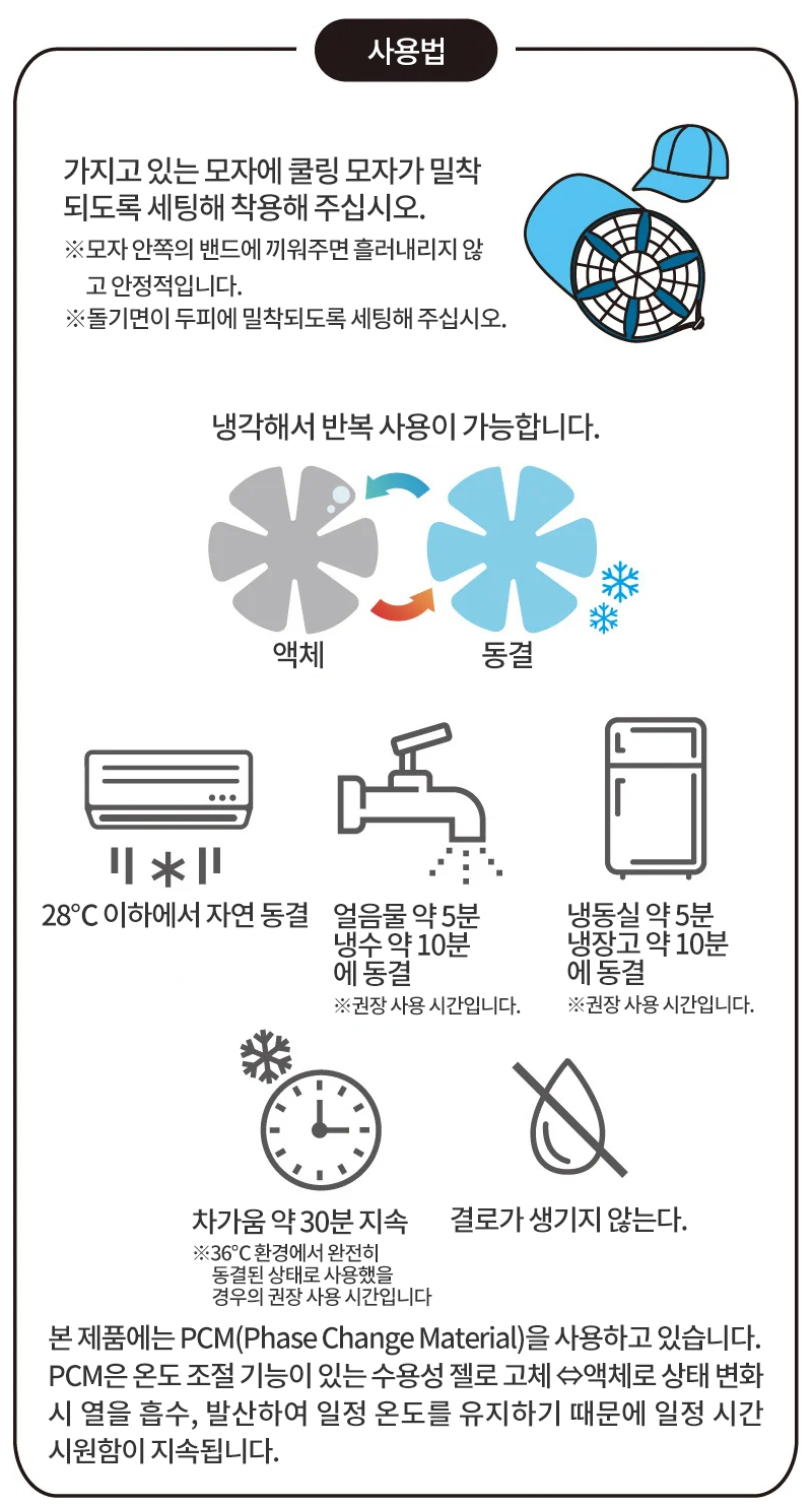 모자에 세팅해서 시원하게. 어린이부터 어른까지 같이 사용할 수 있는 모자용 쿨 아이템