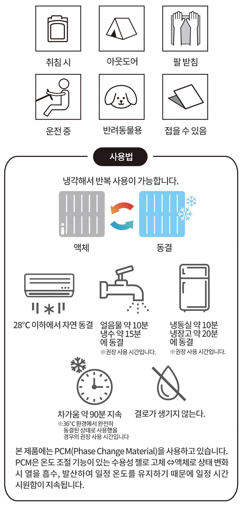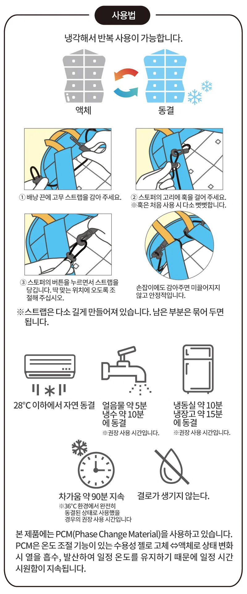 - 얼음 찜질 시 장시간 같은 신체 부위에 계속 대면 동상의 원인이 됩니다. 수건이나 얇은 천으로 감싸서 사용해 주십시오.