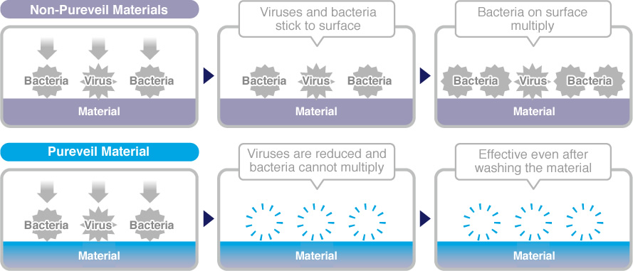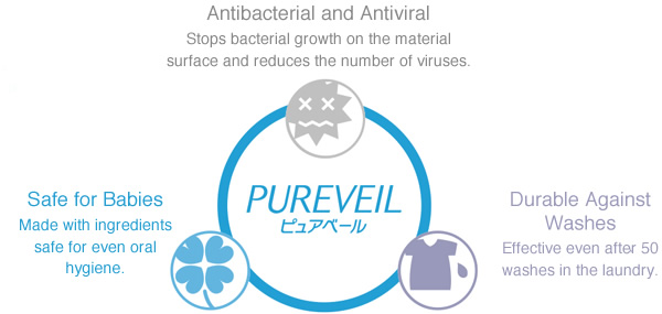 The antibacterial and antiviral Pureveil process was researched and discovered by Professor Hiroki Nikawa from Hiroshima University. He discovered the antibacterial ingredient “Etak®,” which can be embedded into cloth.