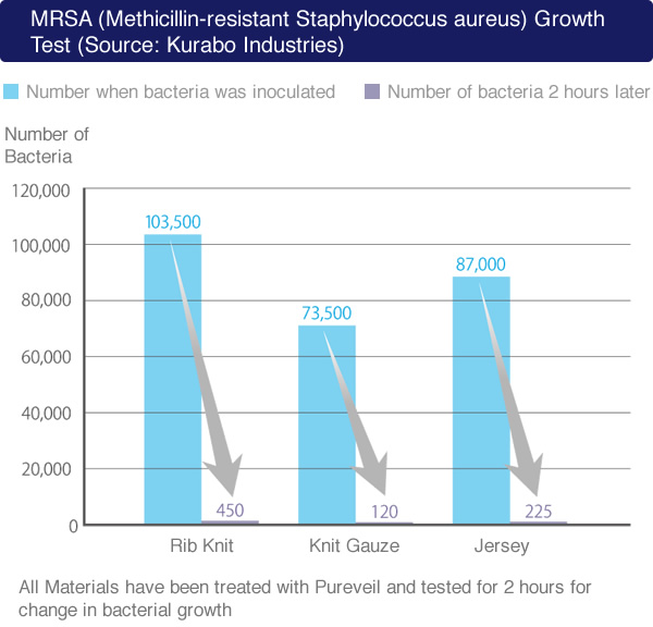 Pureveil has been tested against Staphylococcus aureus, MRSA, E. coli, Moraxella, Aspergilius niger, black mold, etc.