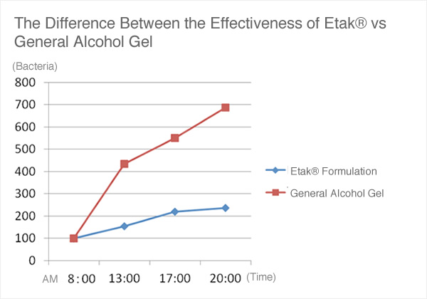 Because alcohol evaporates over time, most alcohol gels are only temporarily effective and can allow bacterial growth over time. On the other hand, the effectiveness of Etak® is long lasting and will keep bacterial growth at bay.