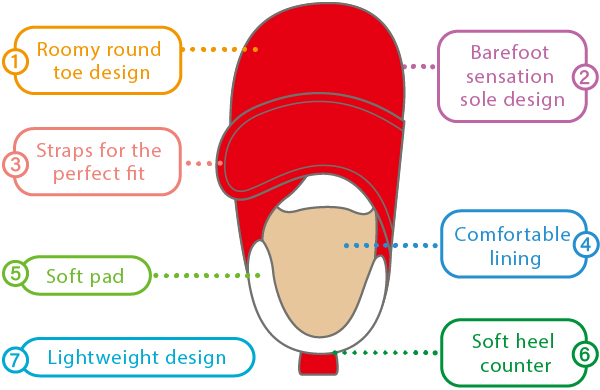 While helping to support the heels at every step, the heel counter secures the feet and provides a snug fit to help reduce stumbles and falls. Designed to be worn comfortably at a time when babies are also actively crawling, the heel counters of our Pre-Walking Shoes are made with softer material than the ones found in our First Shoes series.