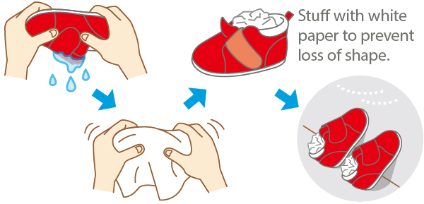 - After washing, dry thoroughly using a dry cloth in a slow pushing and squeezing motion, using caution to ensure that the shoes do not lose their shape. Stuff them with white paper to help them retain their shape and leave them to dry in a well-ventilated place away from direct sunlight.
