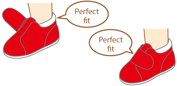 When selecting shoes, try both shoes on to test the fit. Regardless of the size on the label, the actual shoe size will vary slightly depending on the style, material, and construction. It is important to consider both fit and comfort while walking and to make sure that the shoes do not chafe or rub anywhere. There should be enough wiggle room for the toes and some space between the end of the toes and the inside of the shoes.