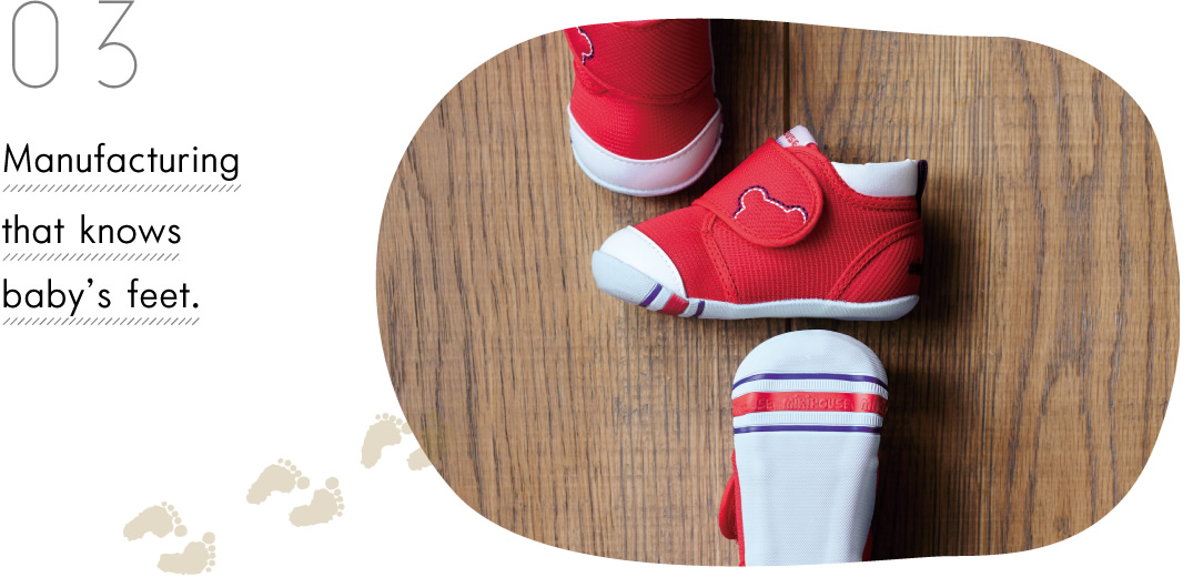 With the feeling and the function in regard to baby’s foot in mind, the materials for each and every part of the shoe are carefully chosen.