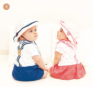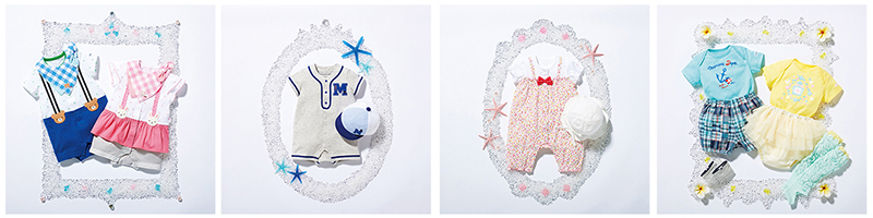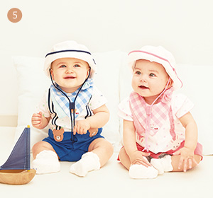 根据服饰的款式和颜色搭配不同的配饰。穿上可爱的衣服,把宝宝打扮的漂漂亮亮的!把宝宝们的每一个瞬间都纪录在相片里。连体服的材质均为100%纯棉,日本制造,可以放心使用。