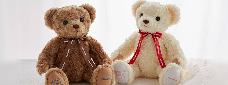 - 在成品上,我们会用刺绣的样式,将您的宝宝的名字、生日、诞生时的体重及身高、一并呈现在小熊的最可爱的两个小脚掌心。