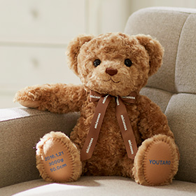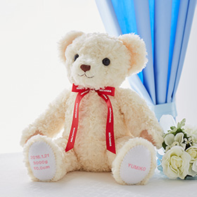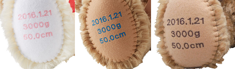 - 在成品上,我们会用刺绣的样式,将您的宝宝的名字、生日、诞生时的体重及身高、一并呈现在小熊的最可爱的两个小脚掌心。