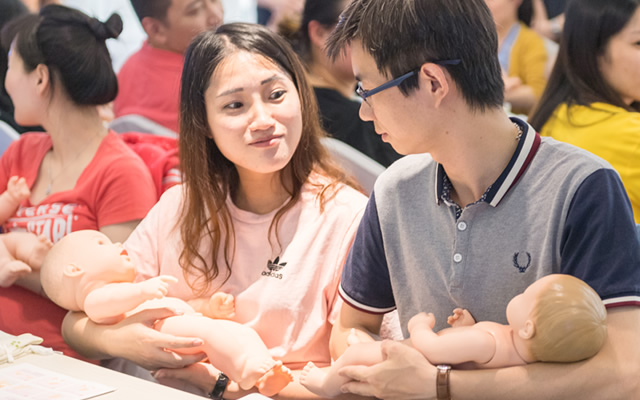 让参加者们亲自体验给模拟宝宝穿内衣的过程。也许没有想象得那么容易,在交流会结束后还在继续练习的准爸爸准妈妈们也不在少数。