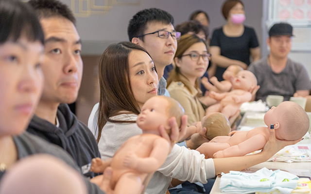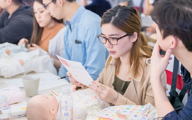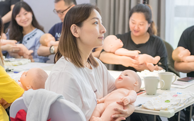 给孩子洗澡也是令新手爸爸妈妈们很紧张的一项。参加者们仔细询问了日本的洗澡方法,并认真思考,希望可以实践到以后给自己宝宝洗澡的过程中。