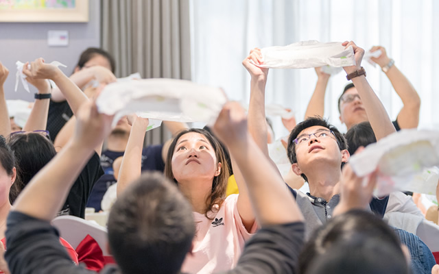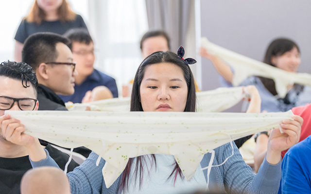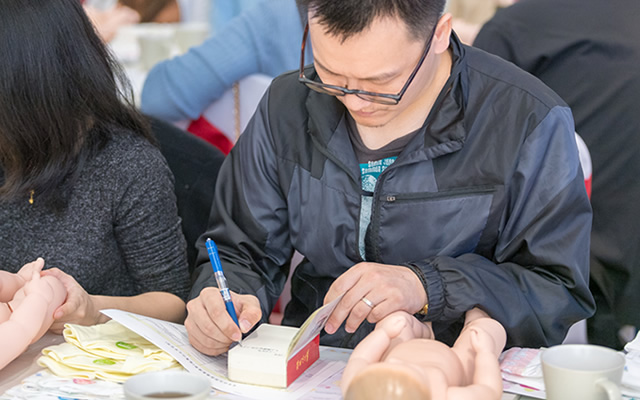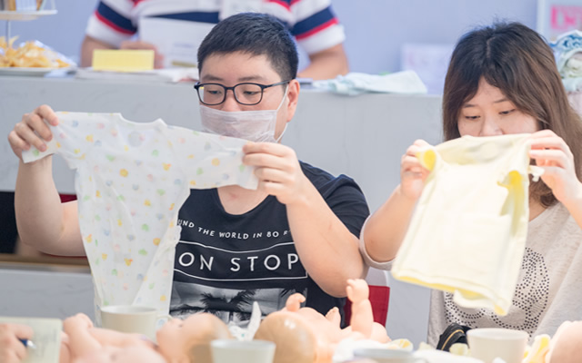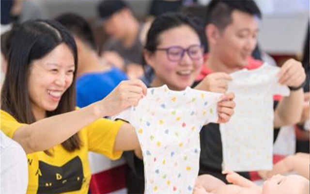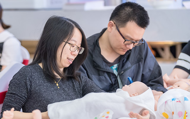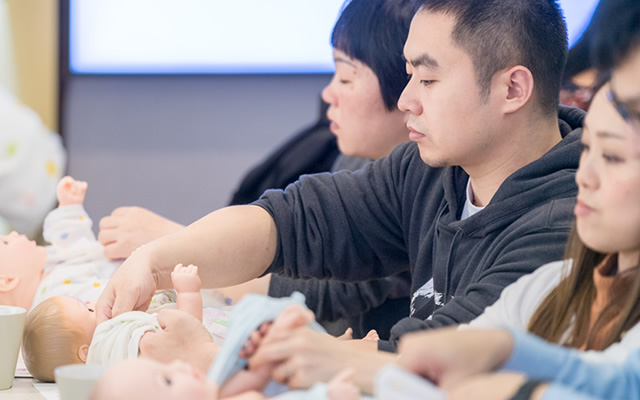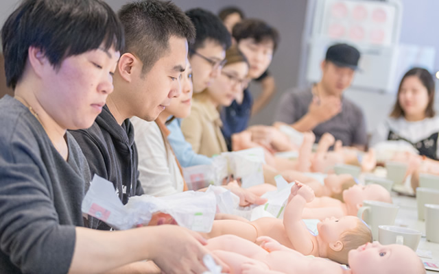 让参加者们亲自体验给模拟宝宝穿内衣的过程。也许没有想象得那么容易,在交流会结束后还在继续练习的准爸爸准妈妈们也不在少数。