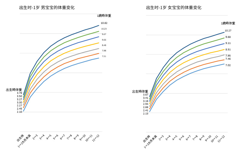 从平成24年厚生劳动省发表的“21世纪出生儿童纵断调查结果概况”(※1)中, “体重及身高的身体发达曲线”来看。月龄越高,体重变化差距越大。例如生个男孩子,出生时2,100g的婴儿,在1岁生日的时候会达到7,500g,但是出生时体重3,000g的婴儿,这个时候多数超过了9,000g。出生时900g的差距,在12个月后会达到1500g。