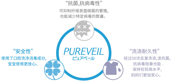 所谓抗菌・抗病毒的PUREVEIL加工技术,是广岛大学大学院二川浩树教授研发出的将“Etak®”抗菌成分固定于面料的新技术。