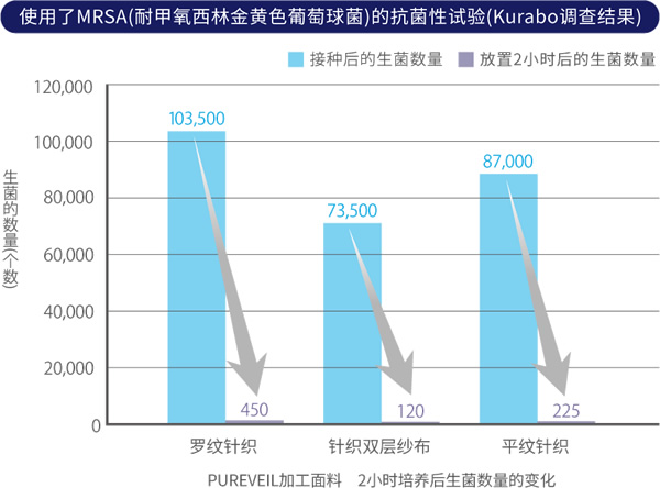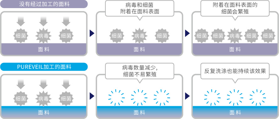 相反,经过PUREVEIL加工的面料,由于含有Etak®成分,可以减少附着在面料上的特定病毒以及抑制特定细菌的繁殖。