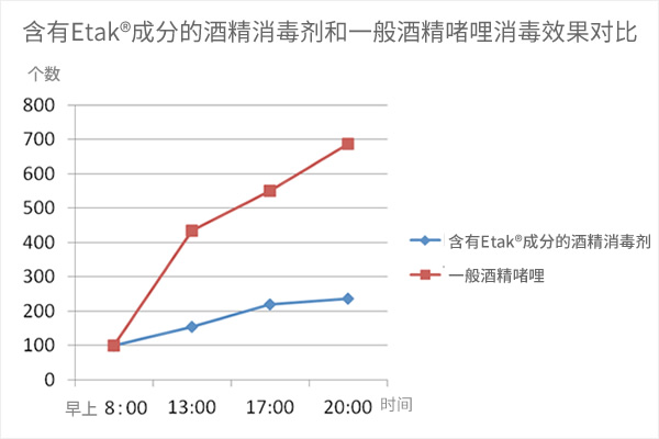 酒精具有挥发性,使用酒精啫哩消毒,经过一段时间后细菌数量还会增加。但是,经过Etak®固定化加工后就可以长时间抑制细菌繁殖,持续抗菌效果。