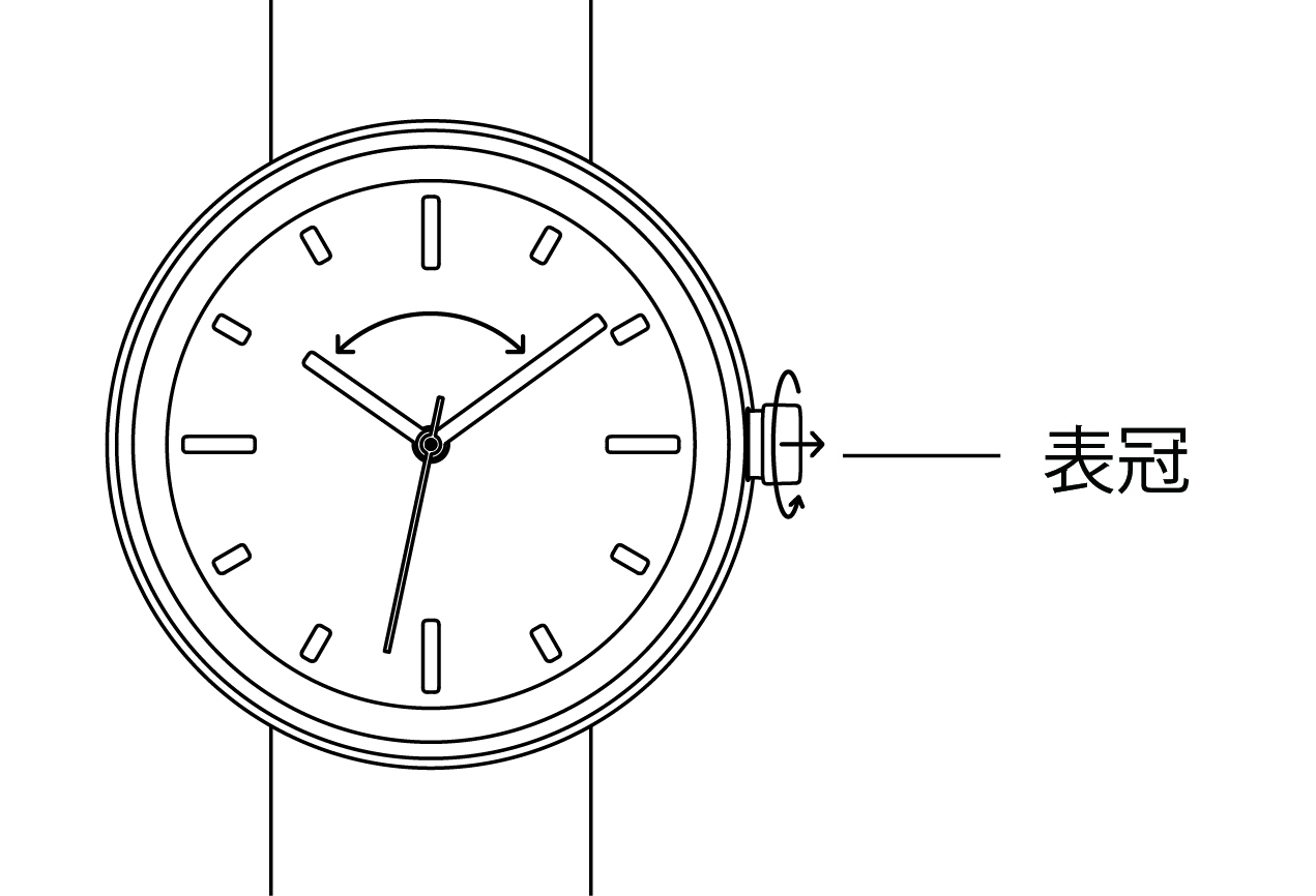 - 时间(时/分)的设置方法:将表冠拔出至最外端,即可开始调校时间。通过顺时针旋转使时间前进,逆时针旋转使时间后退。