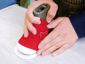 此外,鞋底和鞋面贴合成型后,还采用了高温和压力的硫化工艺。由此产出的薄橡胶鞋底,兼备了柔韧性和弯曲性,从而实现了舒适的步行触感。该工艺是保证鞋底和鞋面紧密结合,不容易变形的特殊制法。