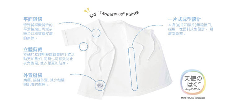 寶寶的肌膚大約只有一毫米厚,僅爲成人皮膚厚度的一半,不足以抵抗外界刺激。爲了保護他們嬌嫩的肌膚,MIKI HOUSE 更加重視服裝的功能性。例如,一片式成型設計:衣身(前片和後片)無縫接口,肌膚零負擔;特殊的立體剪裁:讓寶寶的手臂活動更加自如,同時也可有效防止衣角跑偏,使衣服更加貼身;特殊縫紉機縫合的平滑接線口,可減少縫邊和寶寶皮膚的摩擦,等等細節都是爲了把最珍貴的東西獻給可愛的寶寶們。