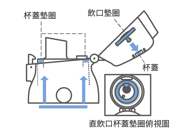 將飲口墊圈的突起部分插入到杯蓋凹槽處。 - 杯蓋墊圈