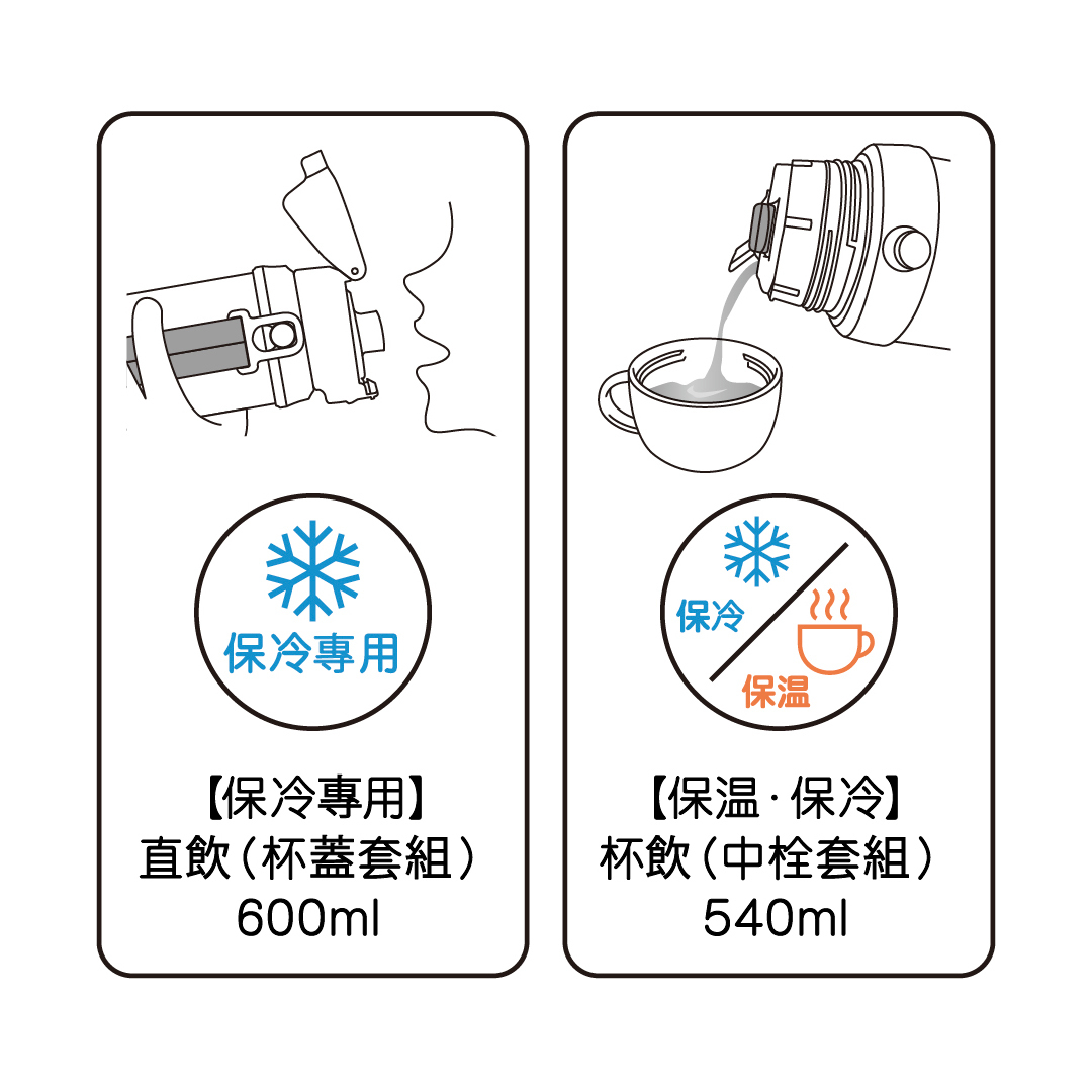 ※保冷效果是指在室温20±2度的情况,將冷水注入至中栓套組及杯盖套组下方,並在垂直放置的狀態下, 從冷水溫度在 4±1 度時開始計時後,將中栓套組(含水杯的狀態)和杯蓋套組放置 6 小時的温度。