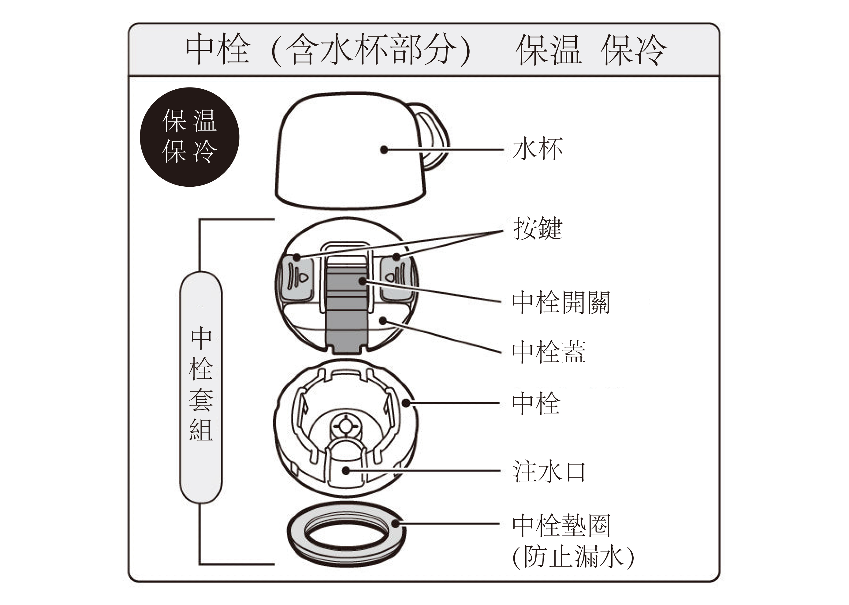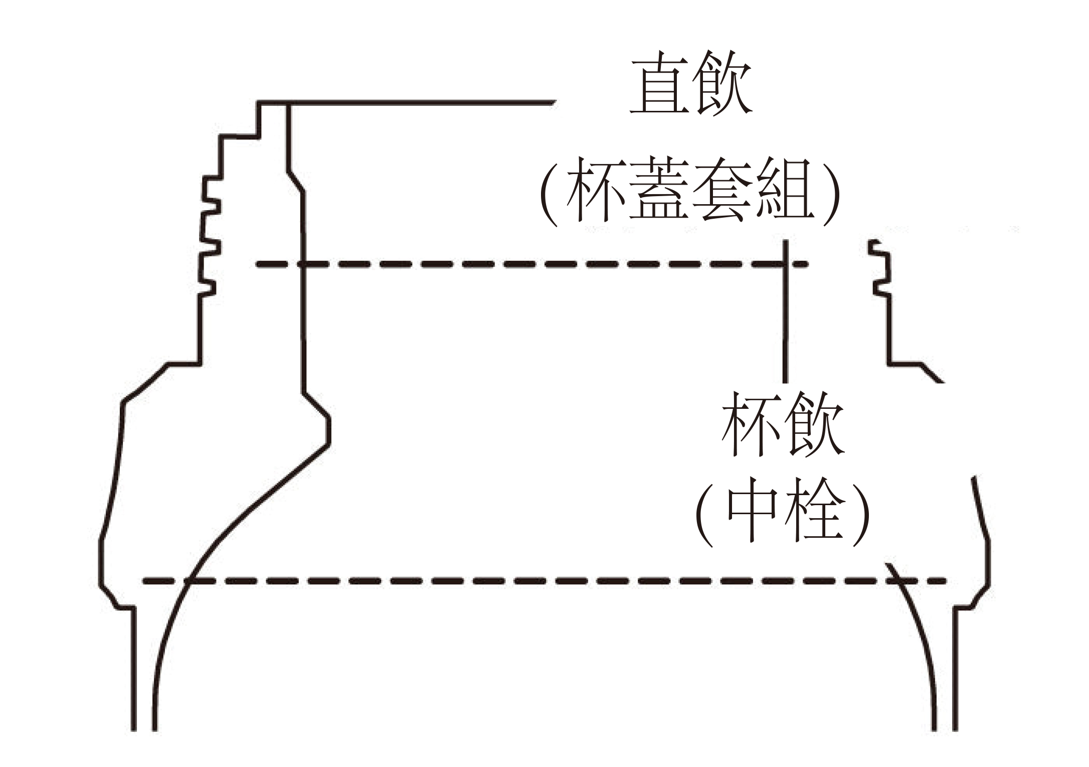 - 使用水杯飲用(中栓套組)時,若裝入熱飲,請務必倒入杯中飲用,禁止直接飲用,熱飲可能因壓力突然噴濺,導致燙傷。