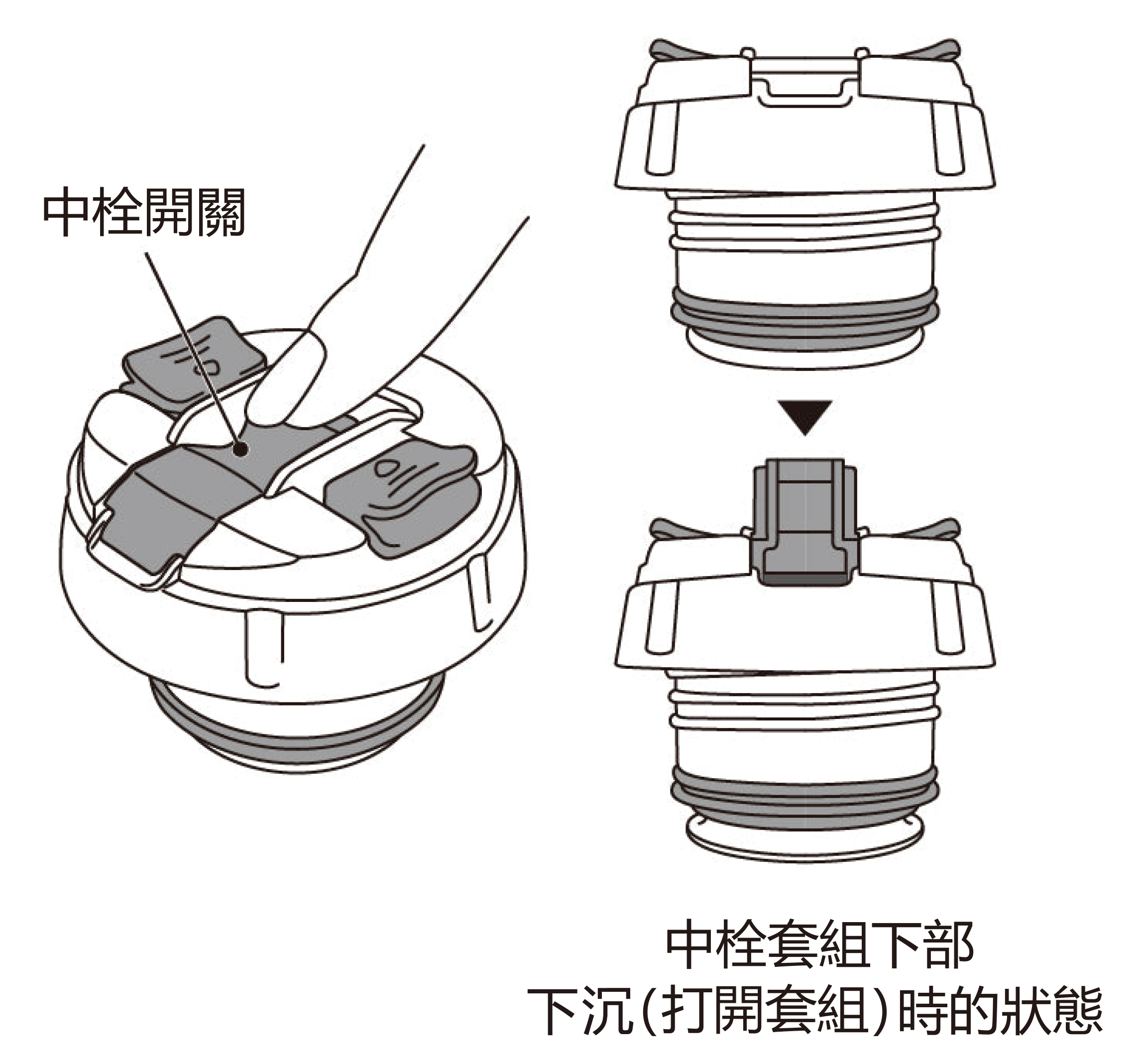 - 關閉中栓套組、杯蓋套組時請勿傾斜或搖晃杯體。這可能會導致飲品溢出。此外,還有可能導致漏水並燙傷或弄髒衣物。