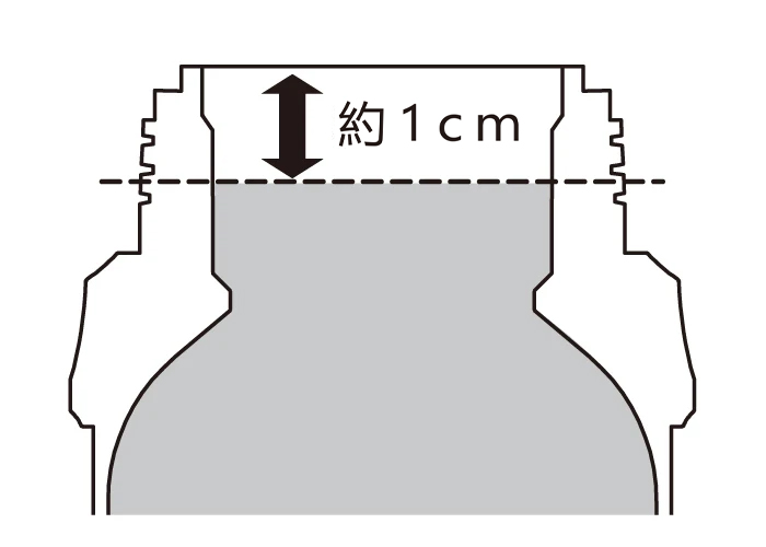 - 倒入飲品的量請勿超過圖片所示位置。如果倒入過多飲品,蓋上杯蓋套組時飲品可能會溢出,或在飲用時流出,導致燙傷或弄髒衣物等情况。