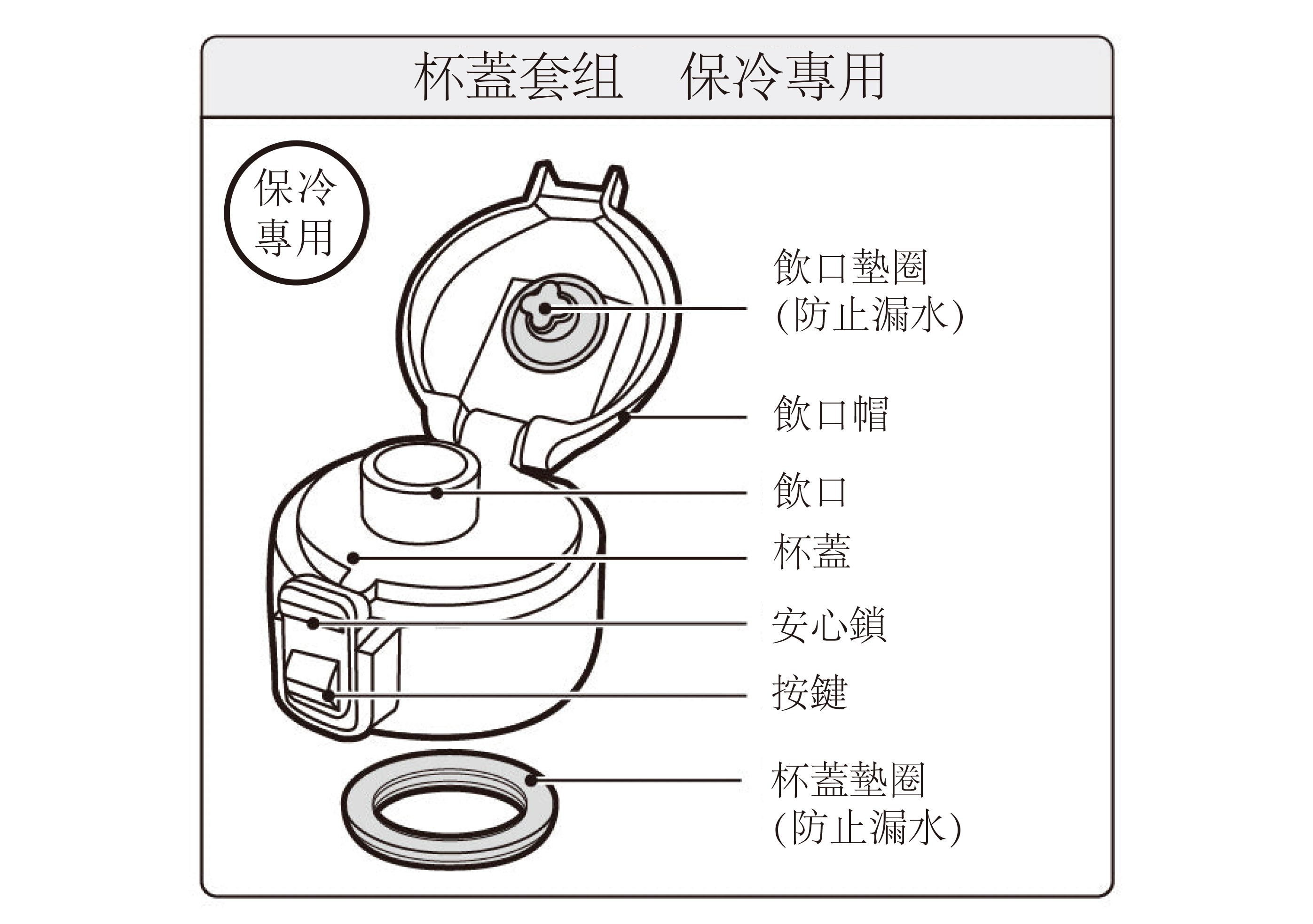 - 請在確認墊圈是否安裝正確,杯蓋套組和飲口套組是否正確擰緊後使用。否則可能會導致漏水等情况。