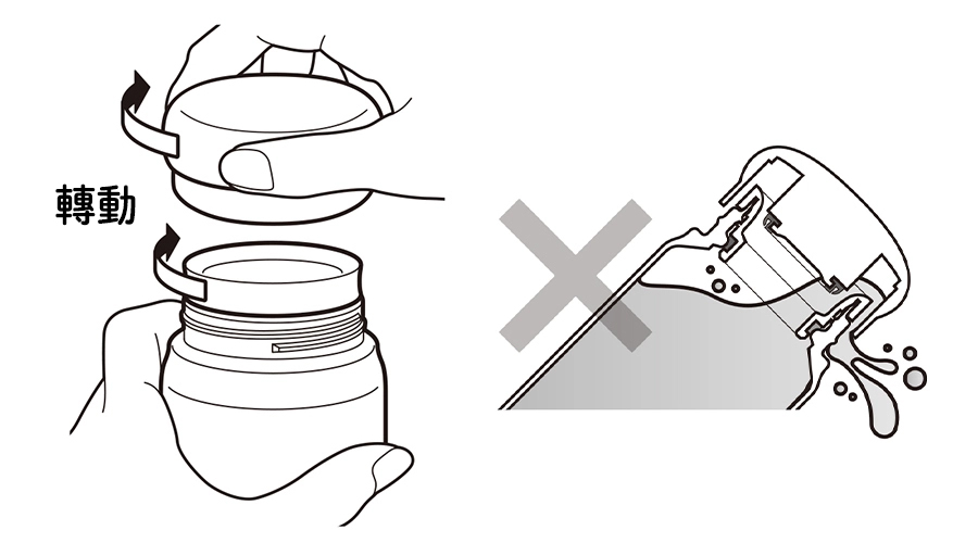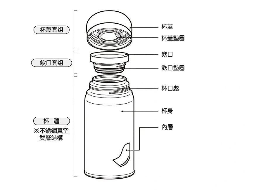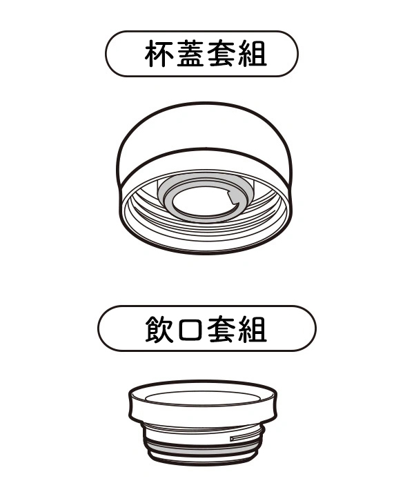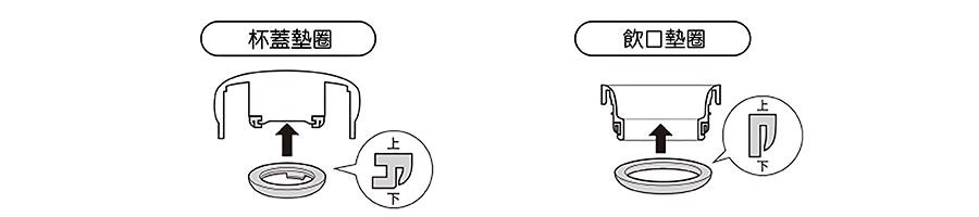 - 請在確認墊圈是否安裝正確、杯蓋套組和飲口套組是否正確擰緊後使用。否則可能會導致漏水等情况。
