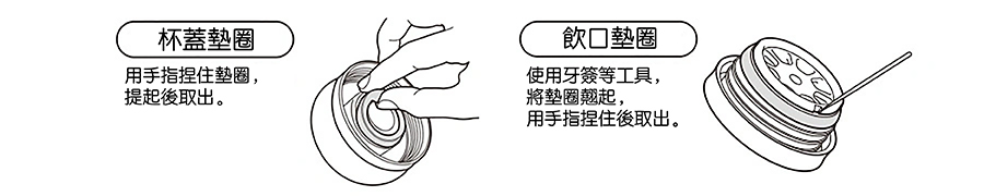 - 從杯體上拆下杯蓋套組和飲口套組,拆下杯蓋墊圈和飲口墊圈後,將每個部件清洗乾淨,並徹底乾燥。清潔後,請務必將杯蓋墊圈和飲口墊圈安裝到正確位置。