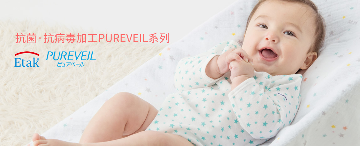 PUREVEIL加工系列產品線, 從嬰幼兒貼身內衣、兒童內衣、嬰兒帽子、手套到寢具等直接接觸寶寶的多種商品, 為寶寶營造安全, 放心的生活環境。