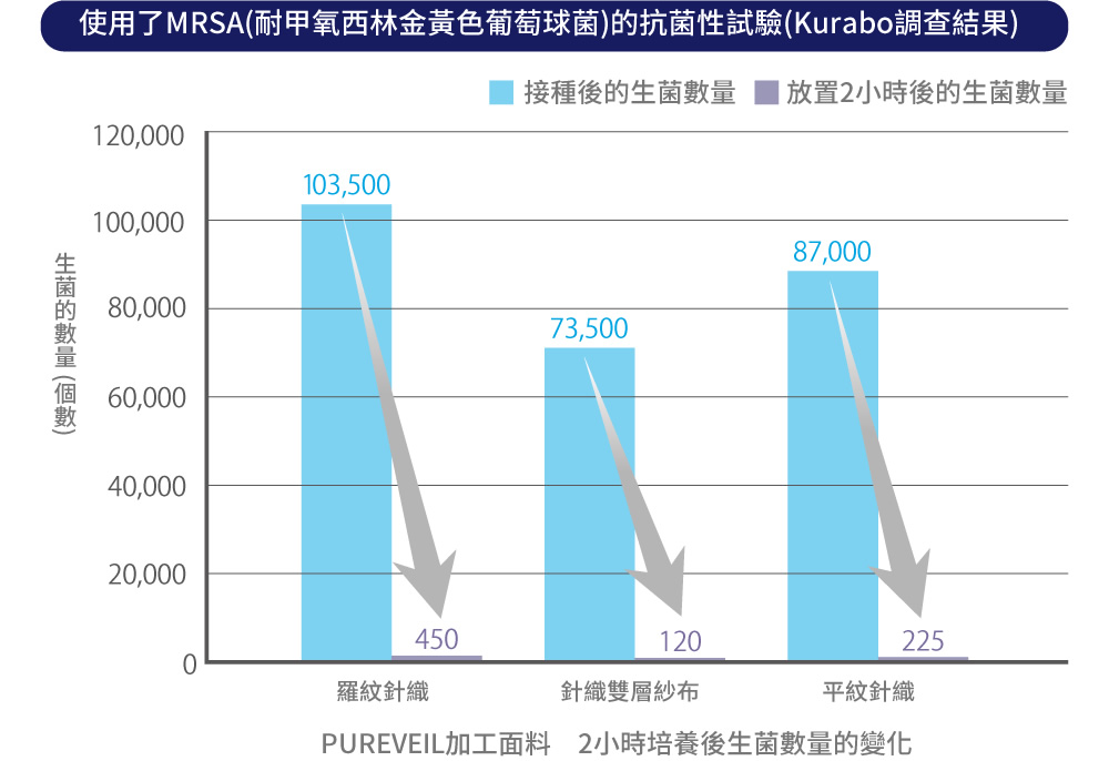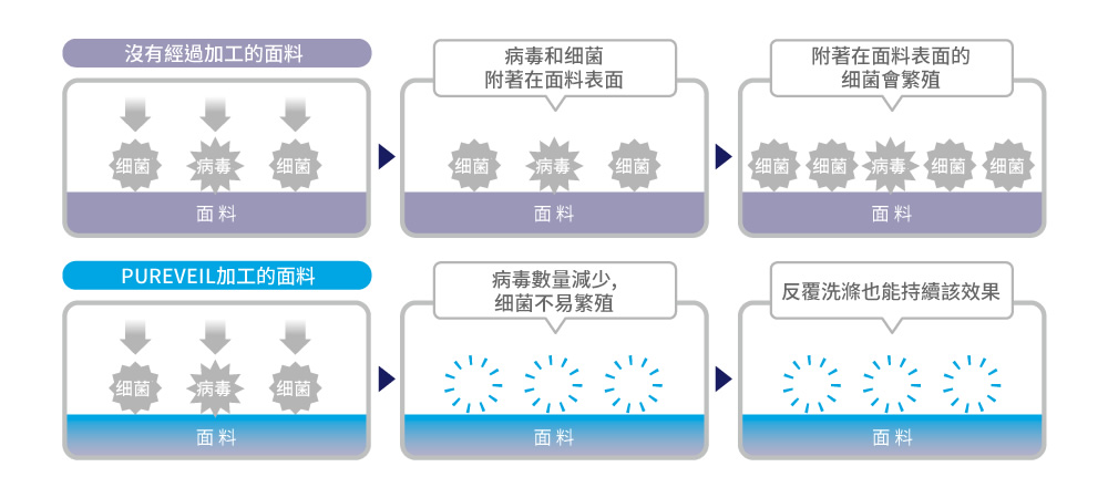 相反,經過PUREVEIL加工的面料,由於含有Etak®成分,可以減少附著在面料上的特定病毒以及抑制特定细菌的繁殖。