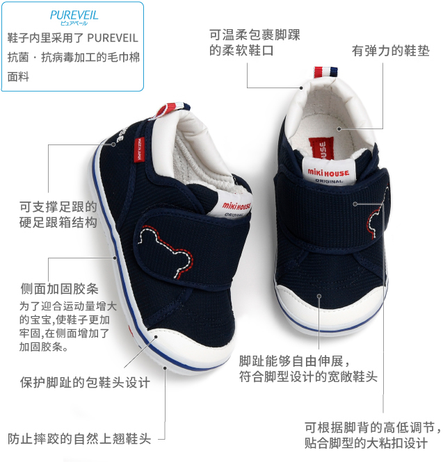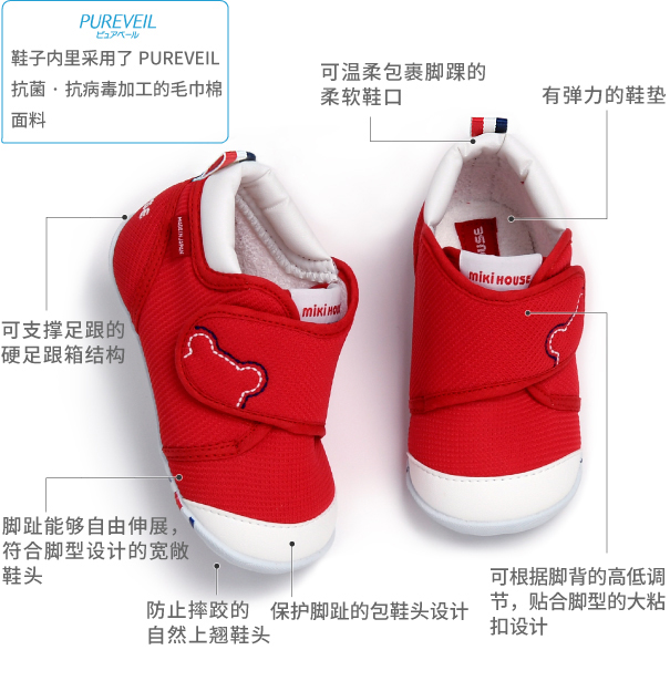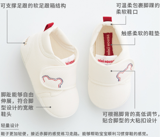第一階段的學步鞋可以輔助走路不稳、容易跌倒的寶寶。鞋面使用了親膚的材質,在柔軟地包住小脚的同時,能够讓寶寶使用脚趾抓地且自然正確地行走。