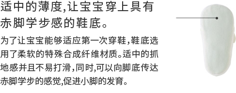 為了讓嬰兒能够適應第一次穿鞋,鞋底選用了柔軟的特殊合成纖维材質。適中的抓地感且不易打滑,讓寶寶有種赤脚在地面走路的感覺,同時促進了脚部的發育。