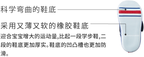 活動量的增大,比起一段學步鞋,二段的鞋底更加耐磨、結實。鞋底的凹凸槽也更加防滑。