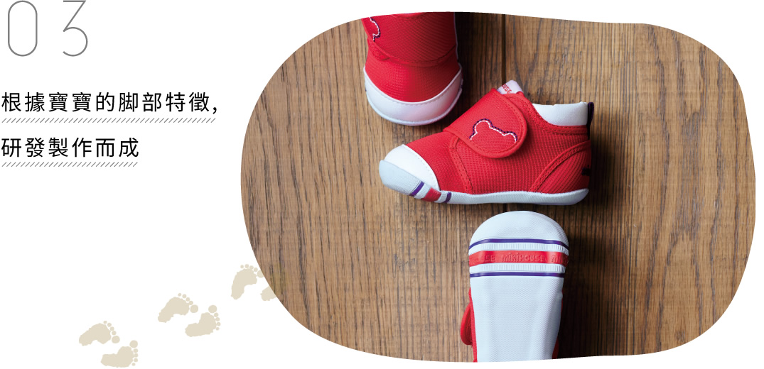 鞋面材料的柔軟性,鞋裡料毛巾棉的親膚觸感以及橡膠鞋底的柔軟及彎曲性等等,將材料的特性發揮到最大限度,精緻的做工讓寶寶舒適地行走每一步。