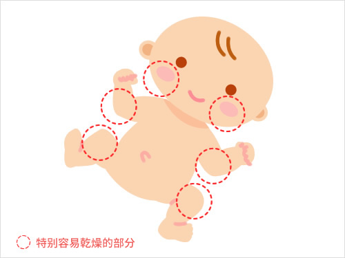 寶寶皮膚的表面(角質層)由於皮脂的分泌量和水分量比成人少很多,所以臉頰、肘部、膝蓋等容易乾燥。